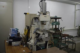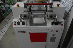 基材ゴムと各種ゴム薬品(補強剤、加硫剤、加硫助剤、加硫促進剤等)を混練してゴムコンパウンドを調製 する装置です。任意の配合組成で混練することができます。テストプレス機は年代ものの機械ですが、ハイストロークタイプで、厚物の加硫にも対応しています。